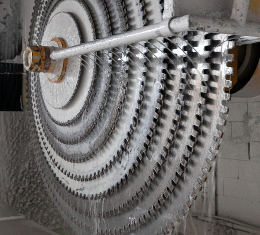После заливки блок нарезаются на плиты требуемой толщины с помощью многодисковой пилы. Плиты, произведенные блочным способом, имеют меньшие отклонения толщины по сравнению с плитами, изготовленными заливным способом